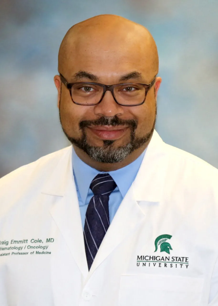 Craig Emmitt Cole, M.D. is a board-certified Hematologist who received his Bachelor of Science degree in physiology at Michigan State University and the College of Lyman Briggs. He received his doctoral degree at the Ohio State University College of Medicine and completed his residency and fellowship at the University of Michigan. Additionally, Dr. Cole conducted post-fellowship laboratory research at the Jerome Lipper Multiple Myeloma Center of Medicine at the Dana-Farber Cancer Institute/Harvard Medical School. He then served as an attending hematologist at Gunderson Health System University at the Wisconsin School of Medicine and Public Health in La Crosse, Wisconsin. He then returned to the University of Michigan Rogel Cancer Center in Ann Arbor, Michigan as an Assistant Professor in the Division of Hematology/Oncology before coming back to Michigan State University in 2019. With a focus on hematology and multiple myeloma, Dr. Cole’s has worked extensively with patient advocacy groups to empower, educate, and bring equitable care to everyone. He is a member of the American Society of Hematology, International Myeloma Society, and International Myeloma Working Group. Dr. Cole currently serves as Director of Clinical Cancer Research at the Michigan State University College of Human Medicine-Karmanos Cancer Institute at McLaren Greater Lansing.